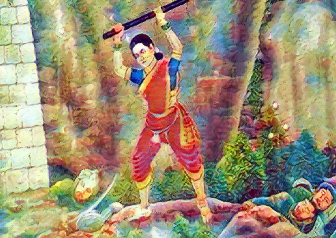 അപകടം മണത്ത അവൾ പിന്നെ ഒന്നും ചിന്തിച്ചില്ല. ആ ഭാഗത്ത് കണ്ട, ഉലക്കപോലെ ഉറുണ്ടുക്കിടക്കുന്ന ഒരു തടിക്കഷണം എടുത്ത് നൂഴ്ന്നു കേറി വരുന്ന തലക്കിട്ട് ഊക്കനെ അടിച്ചു. അങ്ങനെ ഊഴം കാത്ത് നൂഴ്ന്നു വരുന്ന ഓരോ തലയും അവിടെ പൊട്ടിച്ചിതറി വീഴാൻ തുടങ്ങി.