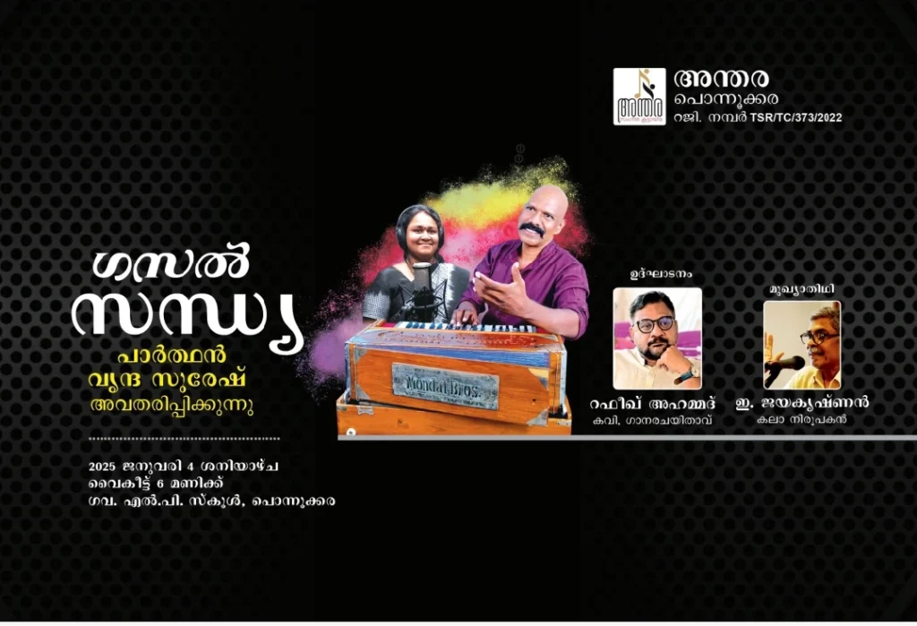 2025 ജനുവരി 4, ശനിയാഴ്ച വൈകീട്ട് ആറു മണിക്ക് പൊന്നൂക്കര ഗവൺമെന്റ് സ്കൂൾ അങ്കണത്തിൽ, തുറന്ന വേദിയിൽ നടത്തുന്ന അന്തരയുടെ ‘ഗസൽ സന്ധ്യ’ മലയാളത്തിന്റെ പ്രശസ്ത ചലച്ചിത്രഗാനരചയിതാവ് റഫീക്ക് അഹമ്മദ് ഉദ്ഘാടനം ചെയ്യും. പ്രമുഖ കലാനിരൂപകൻ ഇ. ജയകൃഷ്ണൻ വിശിഷ്ടാതിഥിയായി പങ്കെടുക്കുന്നുണ്ട്. ഇബ്രാഹിം കുട്ടി (സിത്താർ), ബാബു കുമരനെല്ലൂർ (കീബോർഡ്, ഹർമോണിയം), സുരേന്ദ്രൻ (തബല), ഷാബു (റിഥം പാഡ്), ജയേഷ് (സൌണ്ട്), മുരളി തയ്യിൽ (ലൈറ്റ്) എന്നിവരാണ് ഓർക്കസ്ട്ര നയിക്കുന്നത്.